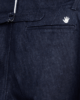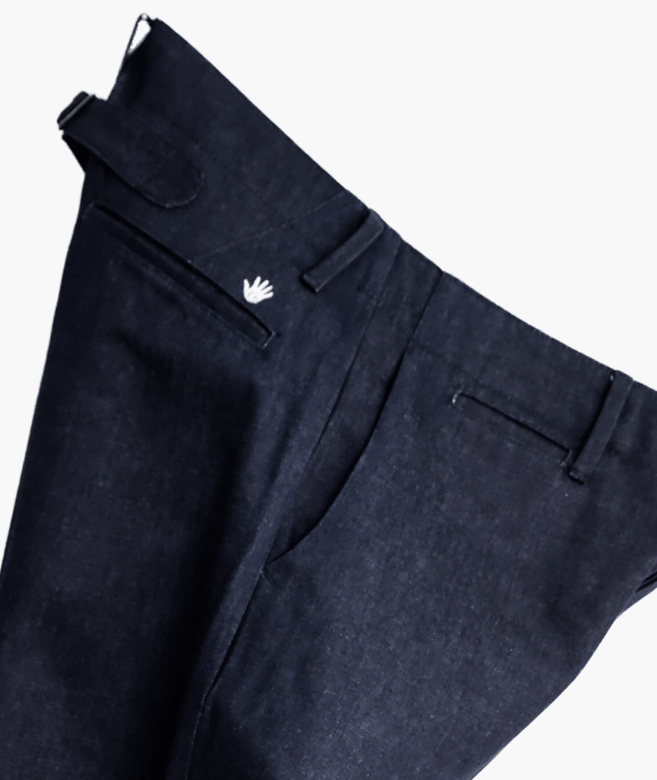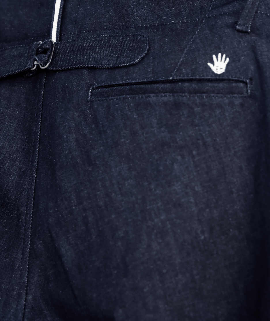 The HR-2 Hemp is a regular fit chinos, made from an Italian Selvedge denim with hemp and white selvedge ID. This fabric is dyed in an unique blue-navy indigo color, woven on 60’s shuttle looms. The chinos are regular rise with straight leg and it comes with four buttons fly. The front pocket bags are made of chambray cotton. Another eye-catching aspect of this garment is the added buckle back. Finally, to give your chinos our identity and craftsmanship, a special stitched hand embroidery has been added in the right back pocket.