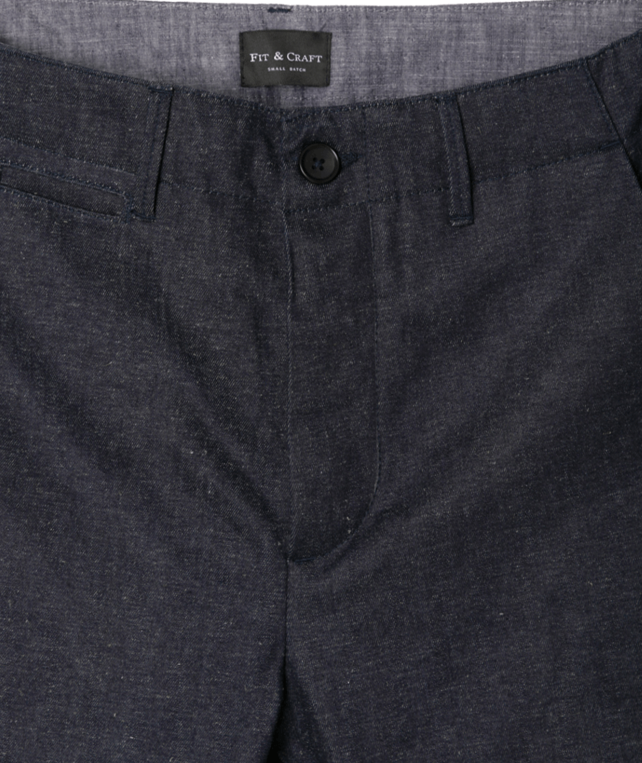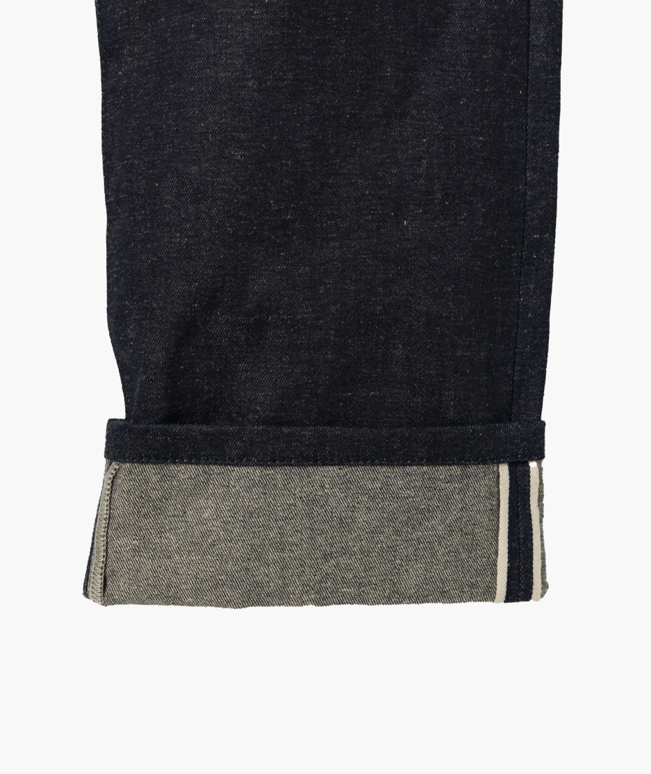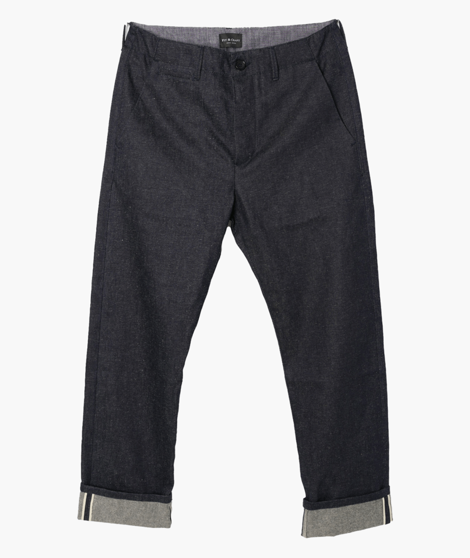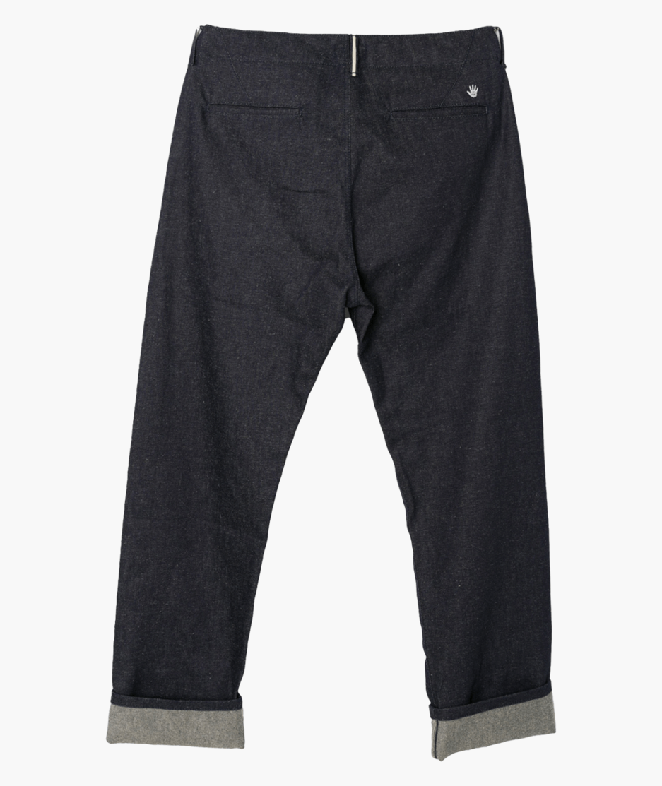 The Hx-02 is a tapered fit chinos, made from an Italian Selvedge denim with hemp. The chinos are slightly high waist rise with tapered leg and it comes with four buttons fly. The front pocket bags are made of chambray cotton. Another eye-catching aspect of this garment is the added buckle back. Finally, to give your denim our identity and craftsmanship, a special stitched hand embroidery has been added in the right back pocket.